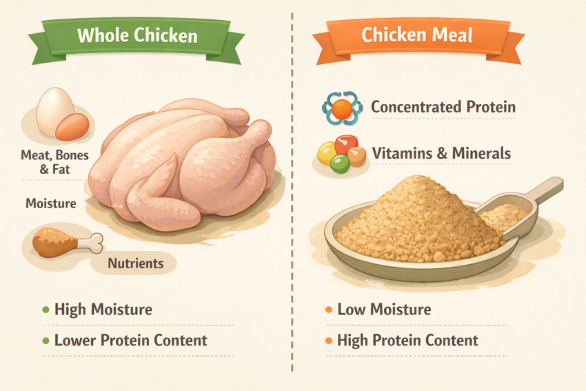 - ✔️ Tavuk unu vs. bütün tavuk: Tavuk unu, nemi çıkarıldığı için ağırlıkça çok daha fazla protein içerir.